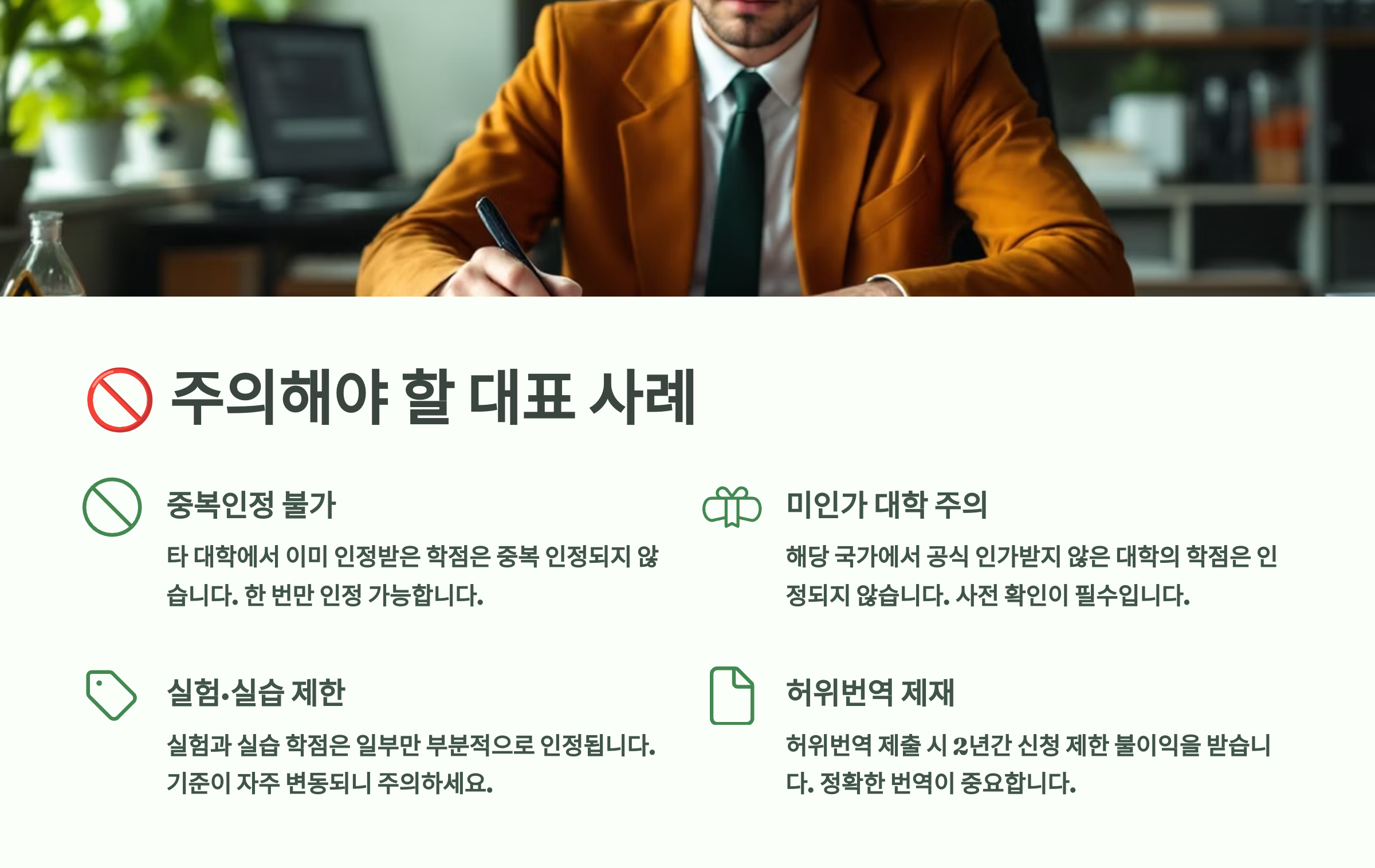 또한 국내 대학별로 인정 기준이 다르므로, 복학 전에 꼭 미리 문의하고, 필요하면 교수님과 직접 상담하는 것도 큰 도움이 돼요. 특히 전공과목은 심사가 더 까다로우니, 철저한 사전 준비가 중요하답니다. 🧑🏫