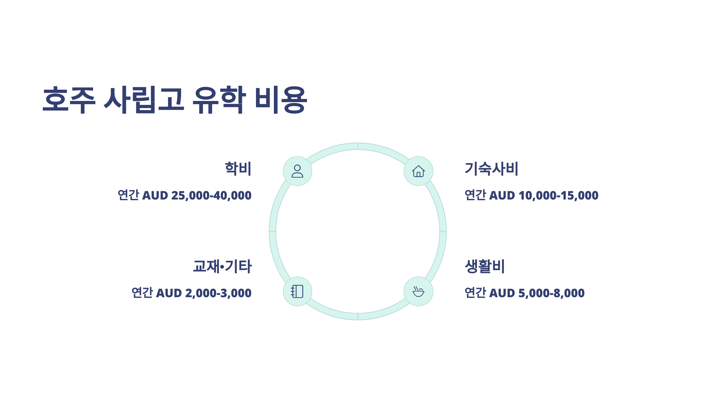 연간 학비 AUD 25,000 ~ 35,000 약 2,250만 ~ 3,150만 원