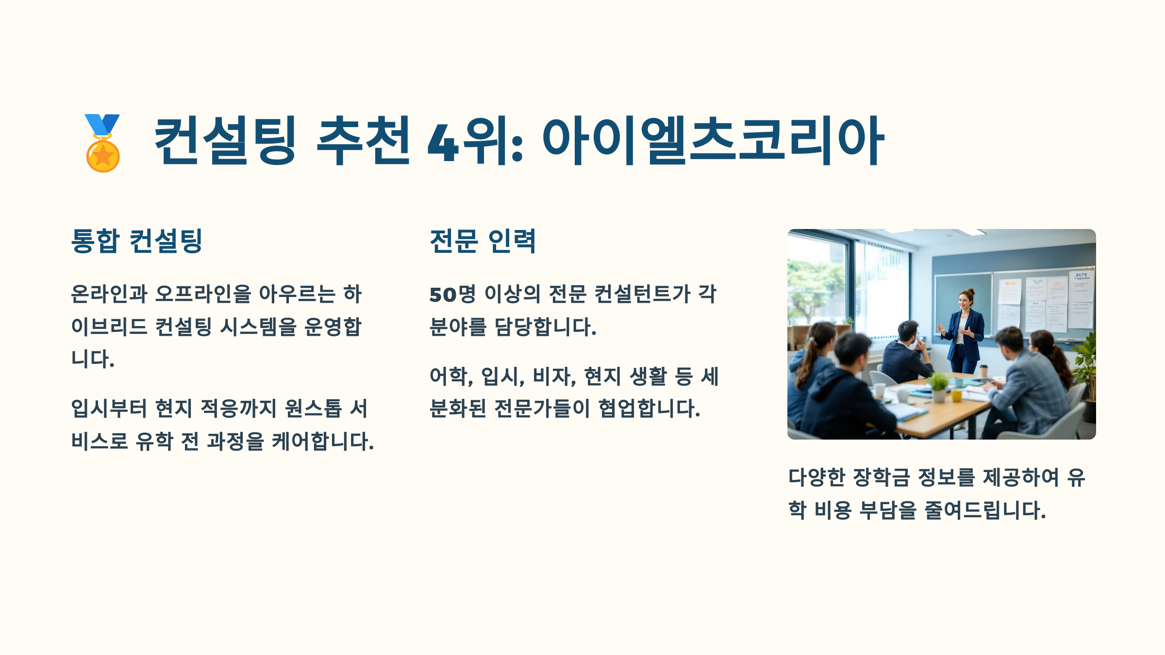 🏅 아이엘츠코리아(IELTS Korea)는 IELTS 시험 대비 전문기관이자 영국, 호주, 뉴질랜드 유학에 강점을 가진 유학 컨설팅 업체예요. 시험 + 입학 + 비자까지 한 번에 관리할 수 있어서 특히 시험 준비 중인 분들에게 인기 많아요! 📘✍️