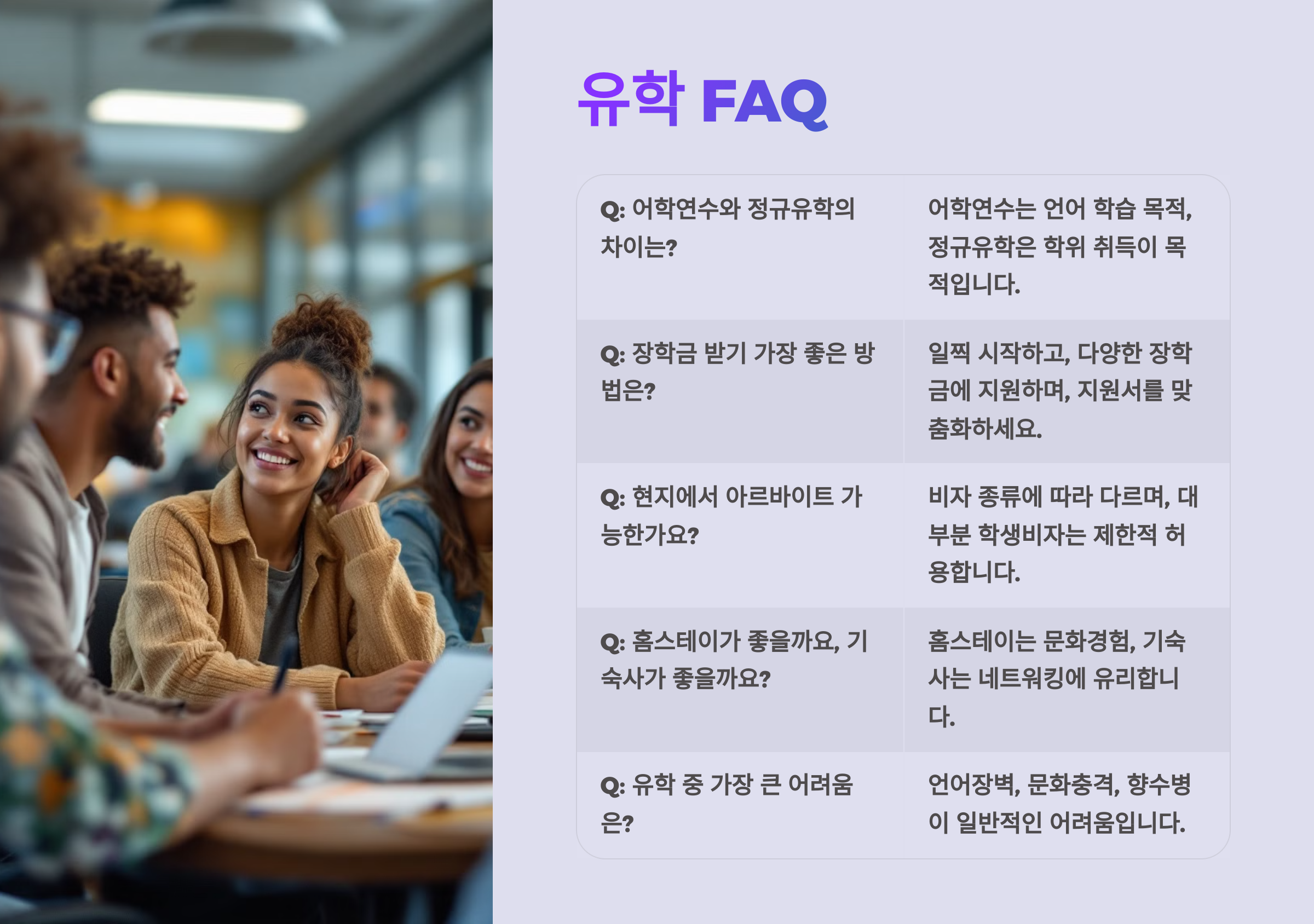 💬 이외에도 예체능 유학, 워킹홀리데이, 취업 목적 유학 등 개인의 목표에 따라 다양한 유학 형태가 있어요. 중요한 건 ‘왜 가는가’예요! 목적이 명확해야 성공적인 유학이 가능하거든요. 😊