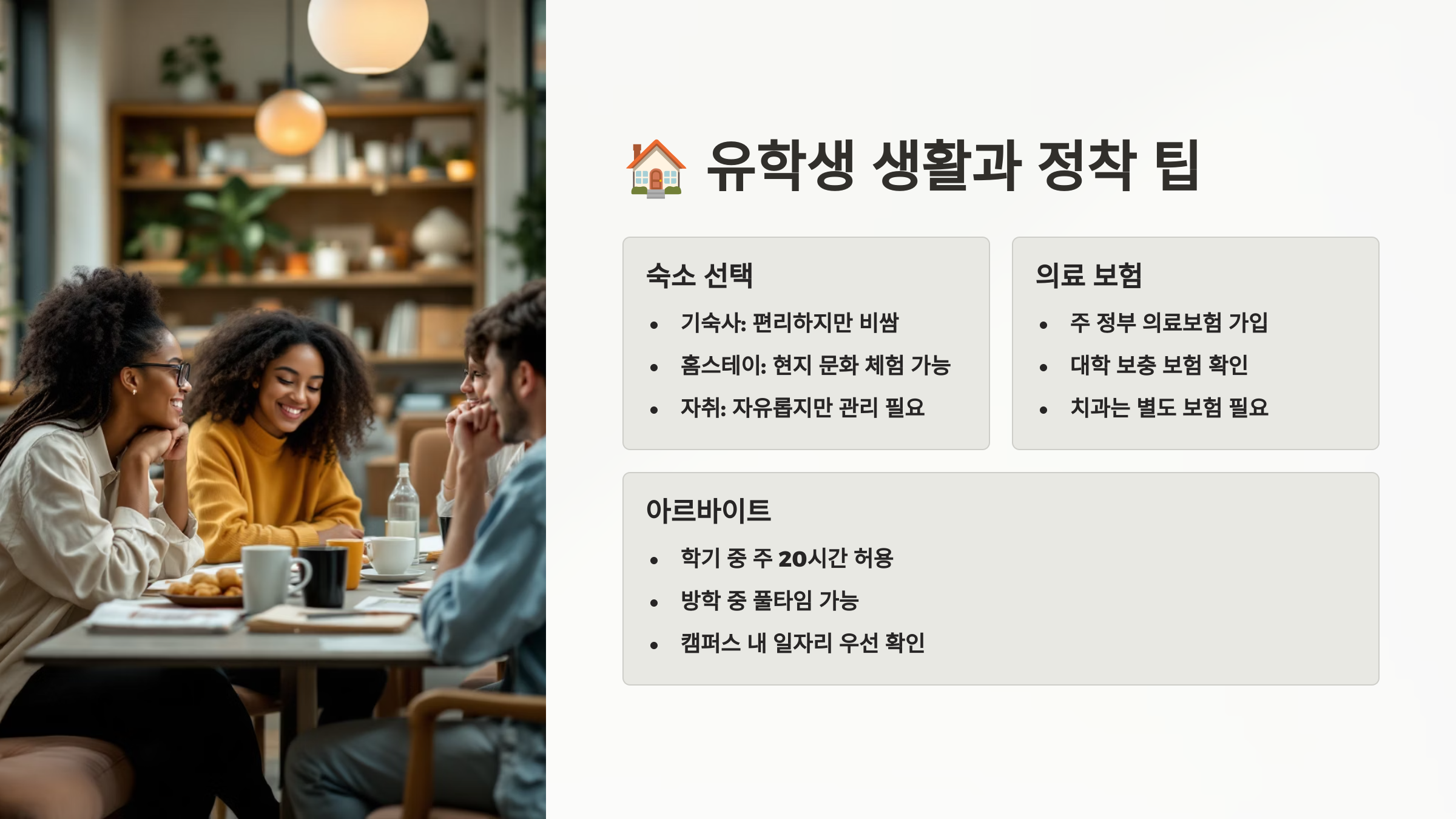 | 주거 | 기숙사, 렌트, 홈스테이 | 초반엔 기숙사 추천 |