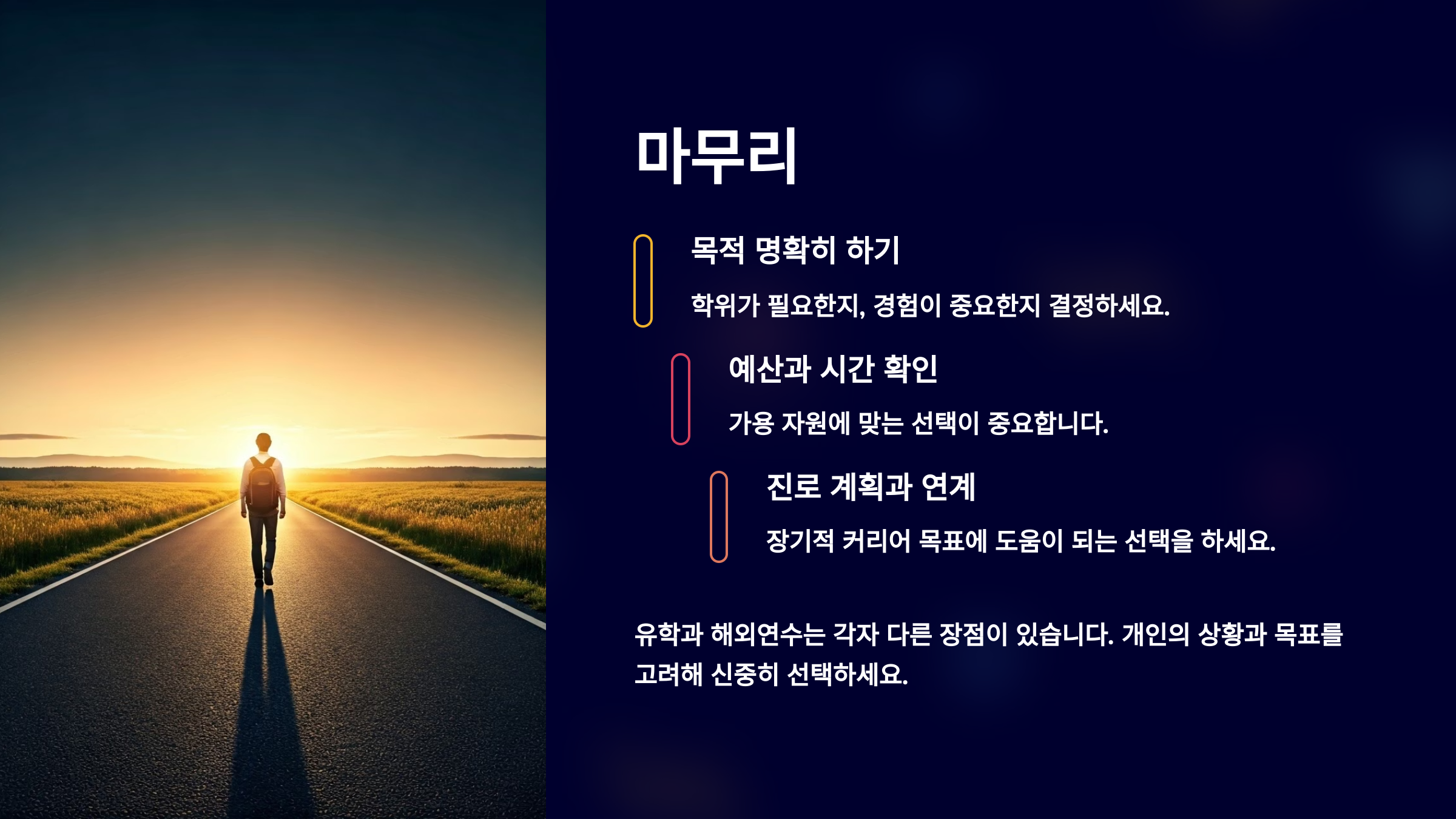 내가 생각했을 때 가장 중요한 건 자신의 목표와 예산, 시기, 경력 설계에 맞는 선택을 하는 거예요. 남들이 간다고 따라가기보다, 나에게 맞는 길을 찾아가는 게 진짜 성공적인 준비예요. 🎯