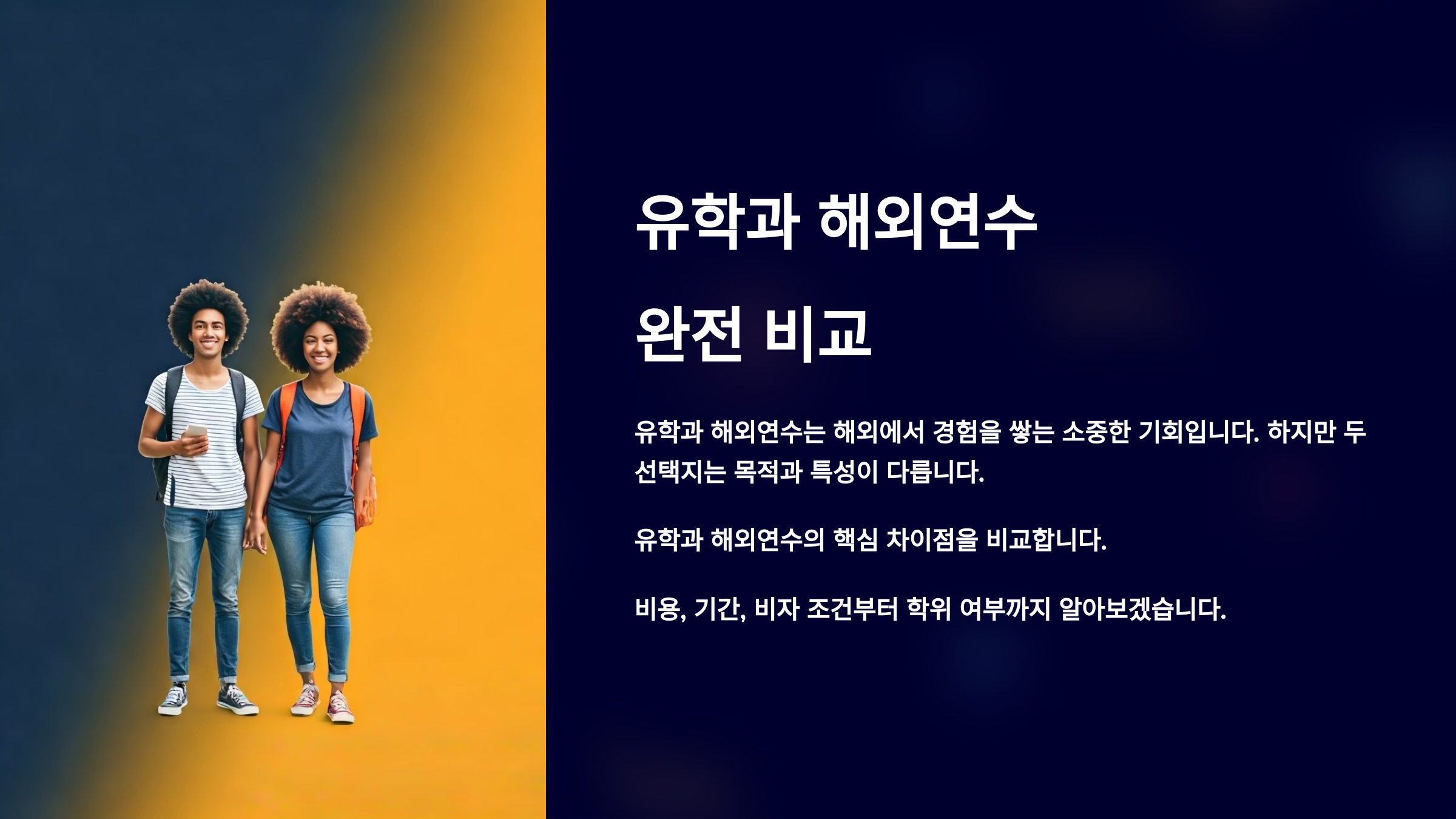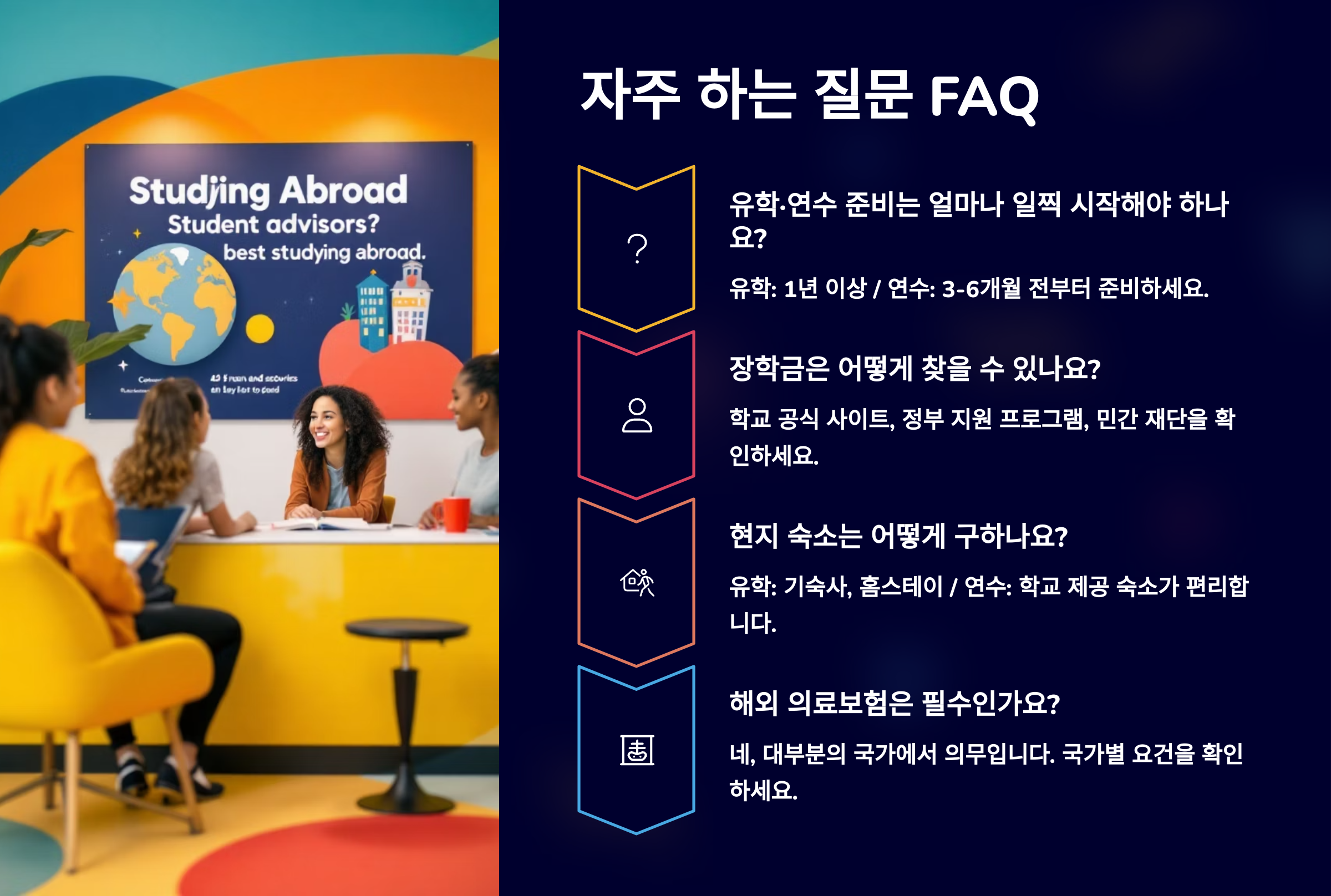 또한 유학은 장기 체류와 생활 정착을 고려해야 하고, 해외연수는 단기 프로그램 중심이라 단기 비자와 생활비 부담이 적어요. 그래서 준비 방식 자체도 완전히 달라요! 📌