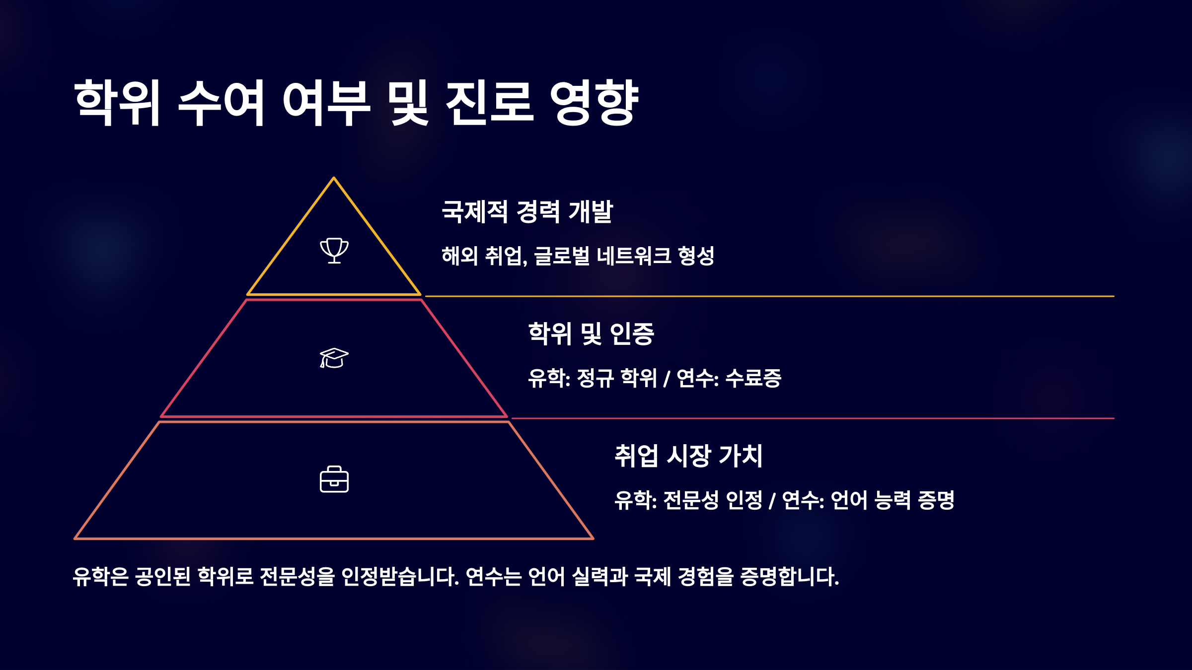 결론적으로 유학은 학문 중심 + 커리어 설계용, 해외연수는 경험 중심 + 스킬 업그레이드용이라 보면 정확해요! ✅