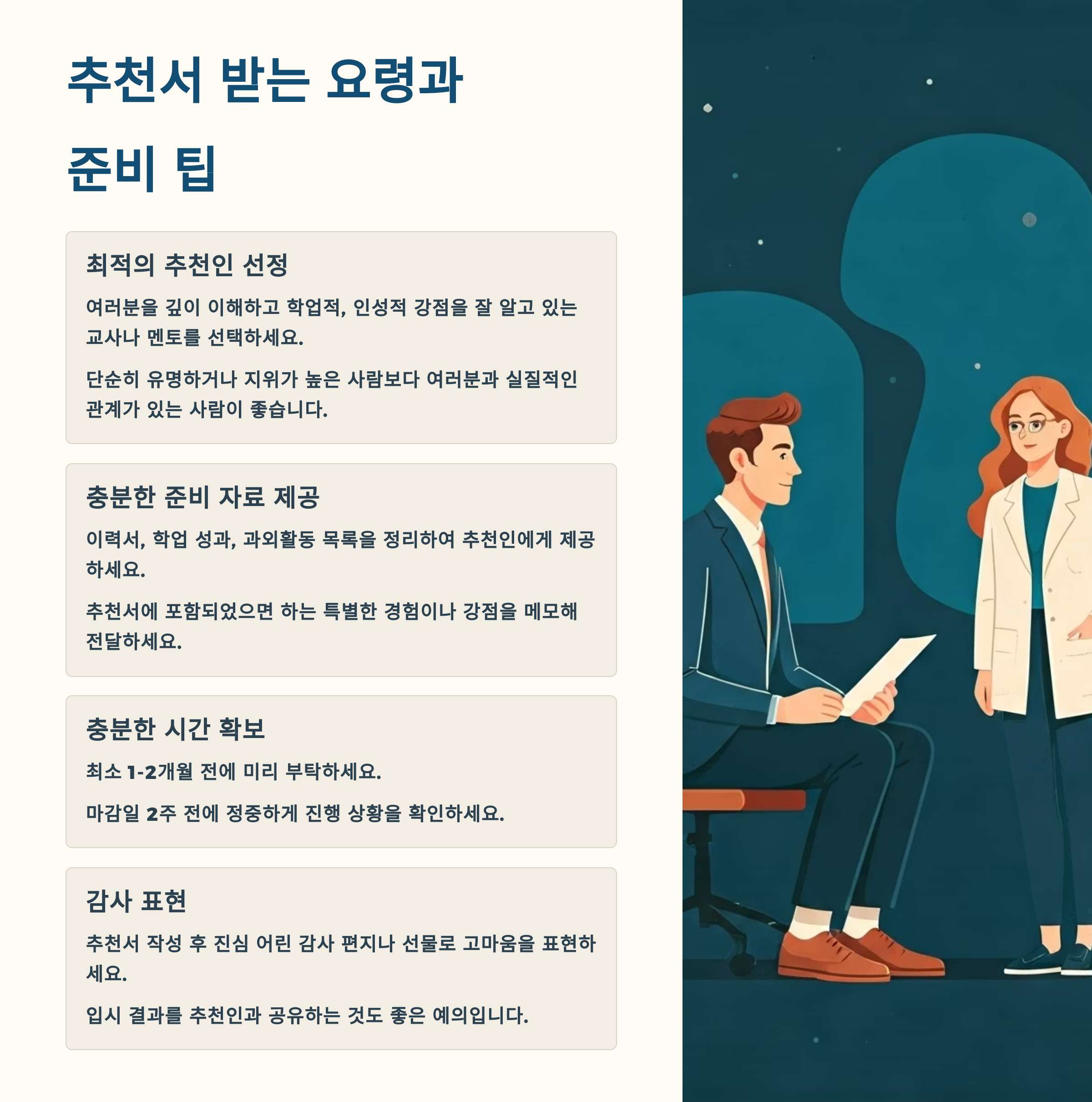 가장 좋은 추천서는 나를 잘 아는 선생님에게 받는 것이에요. 성적이 좋았던 수업의 선생님도 좋지만, 프로젝트, 발표, 협업을 통해 내 성장을 지켜본 교사가 더 강한 메시지를 줄 수 있어요. 🙋‍♂️