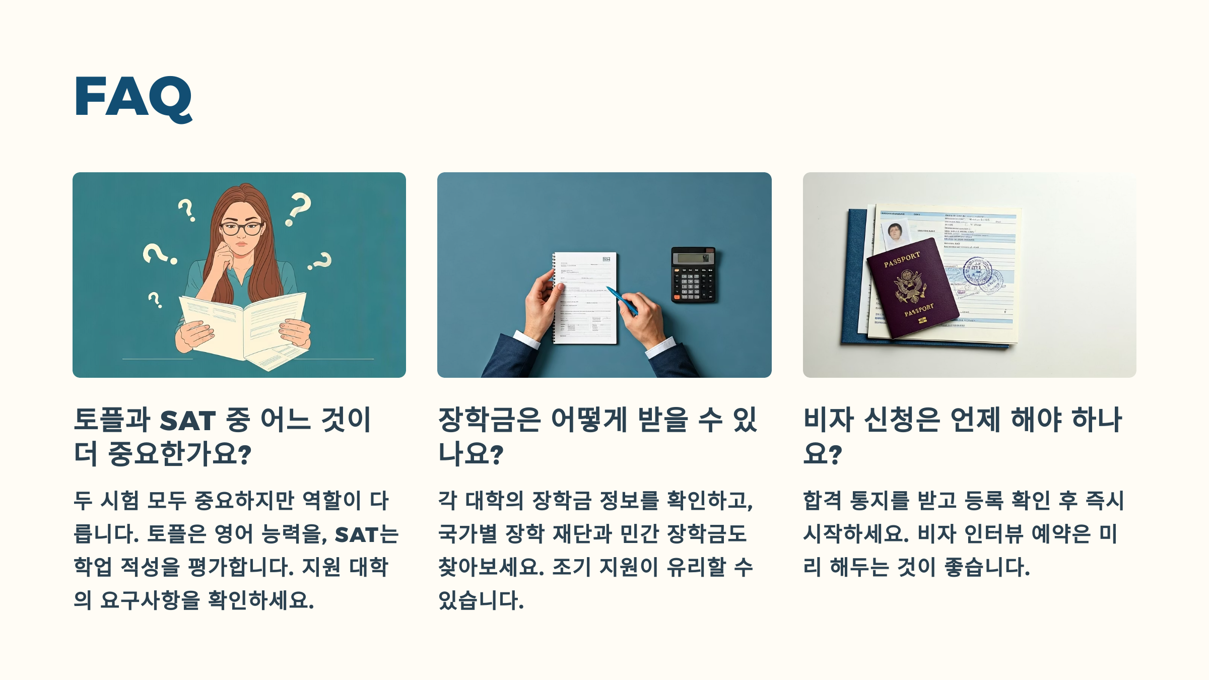 그다음은 TOEFL/IELTS 등 영어 공인성적 → SAT → 에세이 → 추천서 순으로 준비 단계를 나눠서 일정 관리하는 게 핵심이에요. 중간중간 활동 포트폴리오, 자기소개서도 준비하면서 시간을 쪼개 써야 해요. ⏳