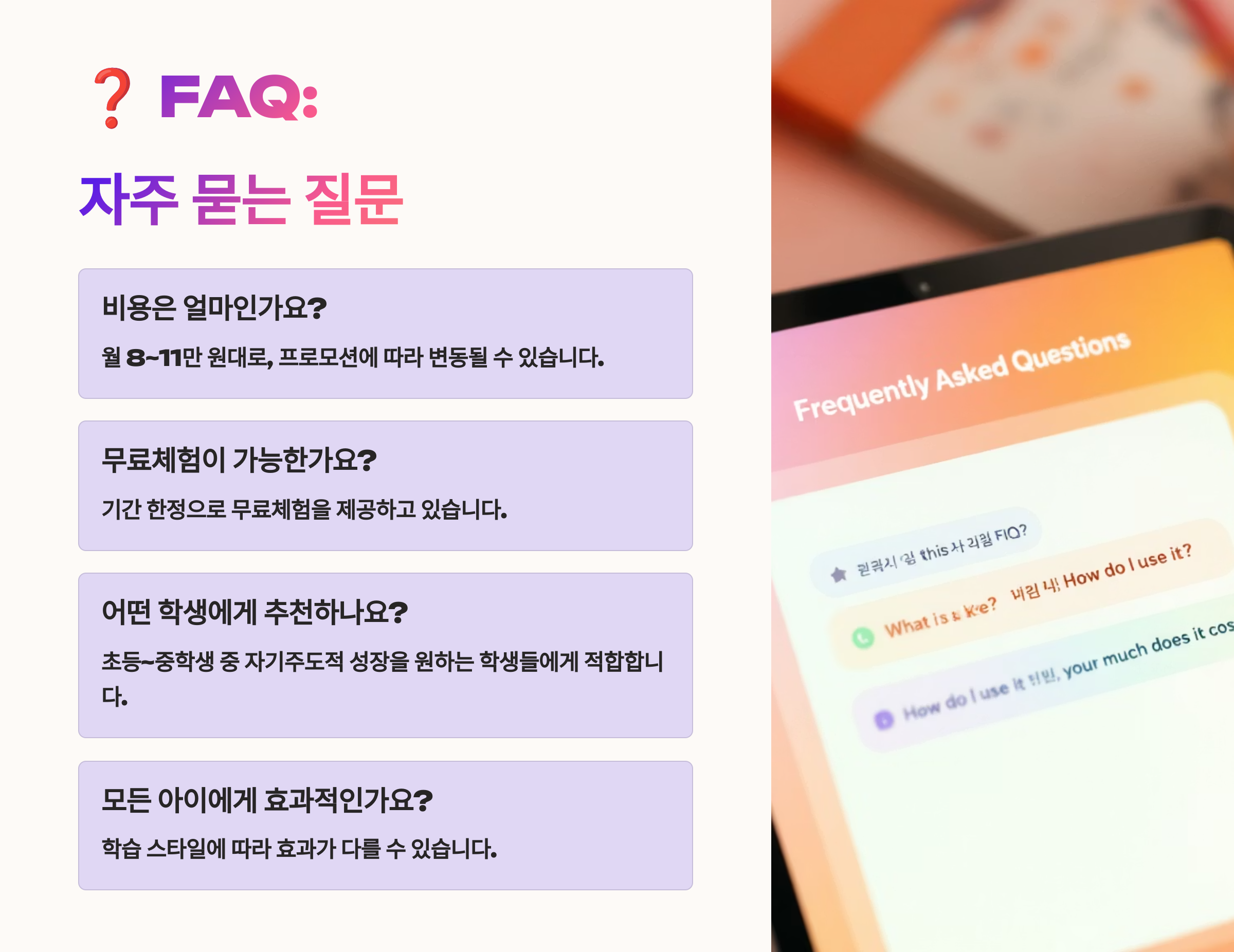 A8. 네! 1~2주간 무료 체험 신청이 가능하고 상담 없이도 간단히 가입해볼 수 있어요. 직접 써보면 아이 반응이 확실히 느껴져요! 🧪