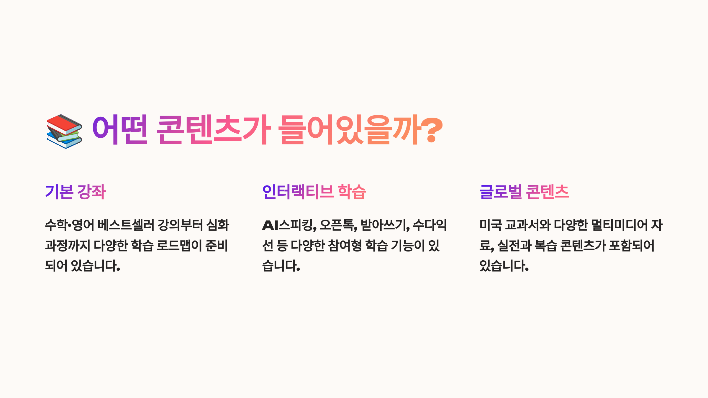 | 특강 콘텐츠 | 한자, 사고력, 스피치 등 확장 콘텐츠 | 과목 외 역량 강화 |
