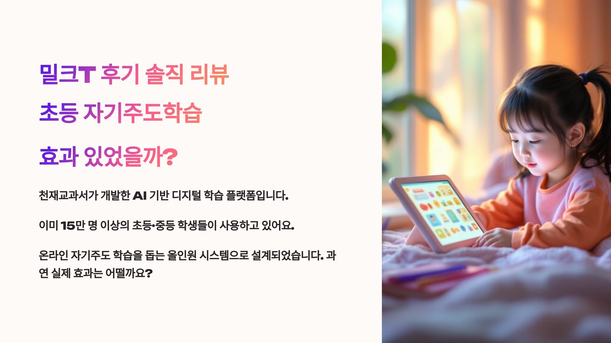 💬 내가 생각했을 때, 밀크T의 자기주도학습 효과는 ‘스스로 학습 루틴을 만드는 기초를 다진다’는 데 있는 것 같아요. 학원을 안 가더라도 “이 시간엔 공부하는 거지!”라는 기분 좋은 자동 루틴이 생긴다는 것, 정말 큰 변화예요. 😊