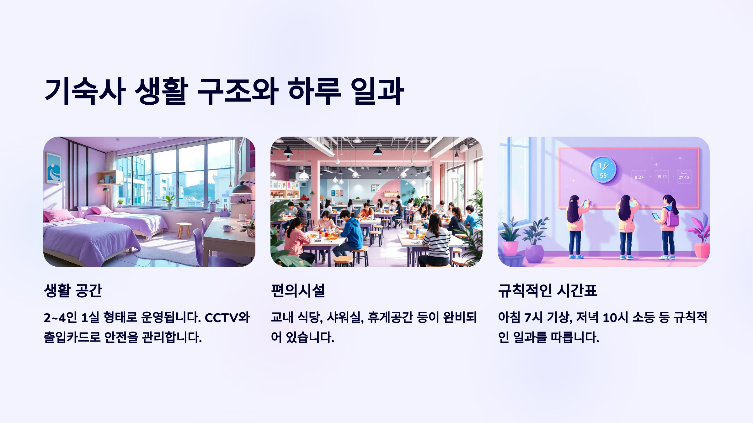 “기숙사 생활이 처음엔 진짜 힘들었어요. 같이 사는 친구들과 맞춰야 하고, 규칙도 많아서 답답했죠. 근데 시간이 지나면서 그게 진짜 공부에 도움된다는 걸 알았어요. 시험 성적도 10등 이상 올랐고요.”