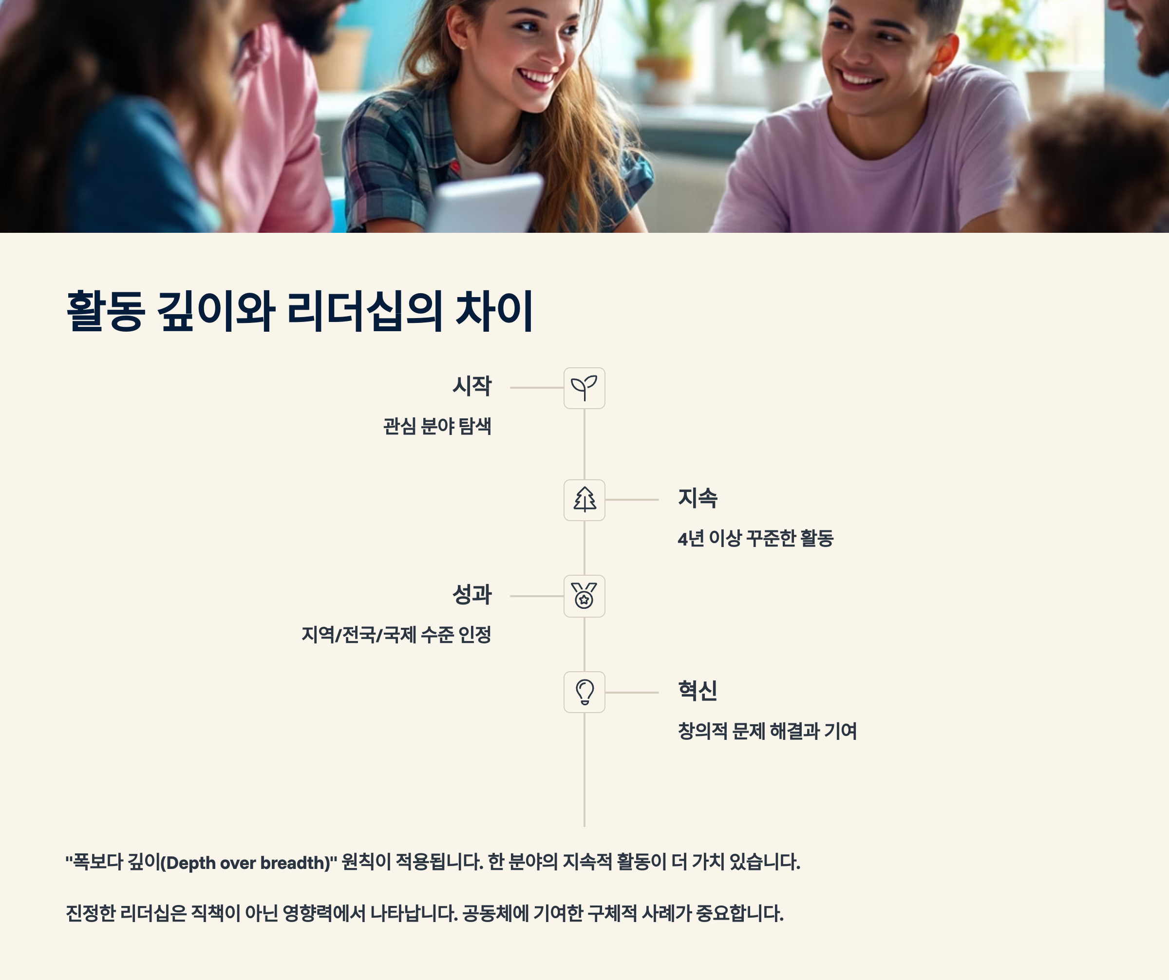 📌 지원서에는 최대 10개의 활동을 적을 수 있지만, 입학사정관은 진짜 중요한 2~3개 활동에 더 집중해요. 많은 활동을 잠깐씩 한 것보다, 하나라도 오래, 주도적으로 한 것이 더 강력한 메시지를 줘요.