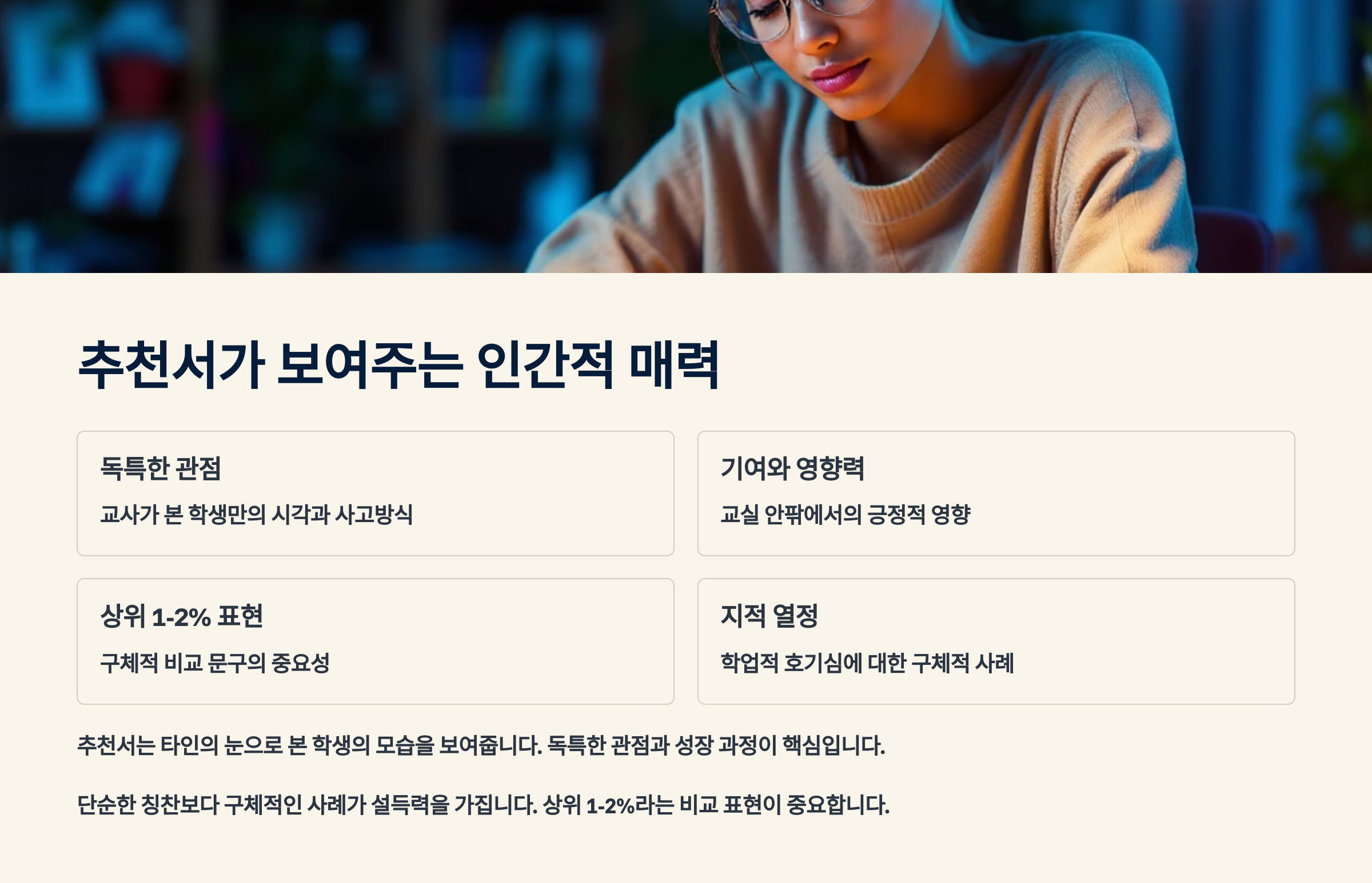 💬 진짜 강한 추천서는 이렇게 말해요: “이 학생은 단순히 성적이 좋은 게 아니라, 지적인 호기심과 책임감을 갖고 주변 사람에게 긍정적인 영향을 주는 존재입니다.” 이런 문장을 한 문장이라도 읽는 순간, 입학사정관의 눈이 멈춰요.